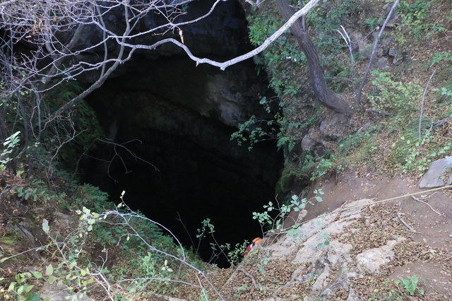 天坑位于房山区百花山山下,故得名:百花天坑。内有两段下降,25米、30米。