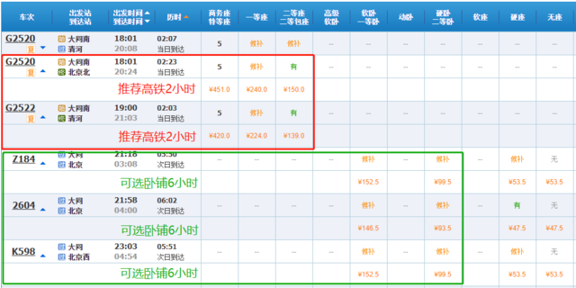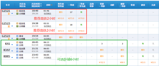 大同到北京推荐车次