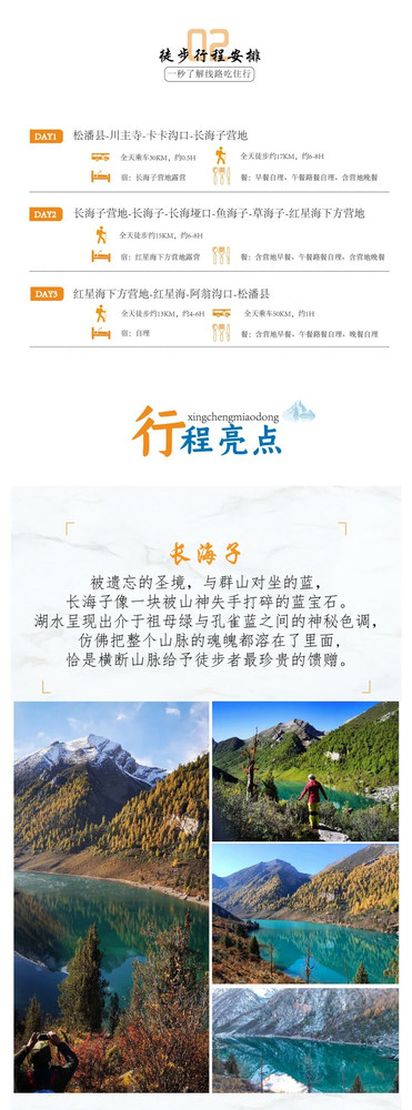 Day1松潘县-川主寺-卡卡沟口-长海子营地 早上8:30左右松潘县集合出发,坐车前往卡卡沟口开始徒步,沿路进入沟内,逆流而上,开始是高原草甸型牧场,而后慢慢是原始杂木树林,夏天葱葱茏茏,秋天是红叶满山。再往里是狭窄的沟壑,四面山峰耸立,悬崖峭壁,有流沙飞石。我们约下午5点左右到达营地。 住宿:长海子营地露营 餐饮:早餐自理、午餐路餐自理、含营地晚餐 需时:徒步约17km,用时约6-8H 海拔:卡卡沟口约3500米,长海子约3750米 Day2长海子营地-长海子-鱼海子-草海-红星海下方营地 早餐之后,我们徒步前往长海子,长海位于卡卡沟尾部,是一条狭长型的高原湖泊,碧绿的湖水,十分宁静。湖泊上部是高山雪水融化流淌而来,湖水清澈透底,还可以看见溪水流淌而下,在湖泊里面形成的蜿蜒水道,形势像盘旋的龙。后我们开始翻越长海垭口,海拔约4200米,从长海翻越垭口路途较短,由于海拔较高,翻越时十分辛苦。到达垭口时,就可以欣赏到红星岩壮观的景象,周围的雪山,卡卡沟和阿翁沟风光。下山以后,我们就进入了阿翁沟,下山的道路有一段是流沙石路段,有点难走,后面经过一处高山牧场,在一路往下进入森林,走出森林就进入鱼海子,沿着山谷一路前行经过草海后抵达今晚的红星海下方营地。 住宿:红星海下方营地露营 餐饮:含营地早餐、午餐路餐自理、含营地晚餐 需时:徒步约15km,用时约6-8H 海拔:长海子约3750米,长海垭口约4200米,星海下方营地约3600米 Day3红星海下方营地-红星海-鱼海子-阿翁沟-松潘县 早餐以后,我们前往红星海,徒步一段木栈道后到达红星海垭口的下边,翻越红星海垭口非常困难,坡度约70度,垂直高度200米,翻上垭口后往前行走约150米,就看见了红星海。红星海海拔约3900米,四周山石堆积,山峰耸峙,湖面宽大平静,湖水湛蓝,站在这红星海前,给人一种震撼的感觉。红星海位于阿翁沟的最尾端,在红星岩的脚下,故名红星海。游玩拍摄后徒步到鱼海子乘坐车辆返回松潘县,当日返程的队员可定九寨黄龙站的票,将顺路送您至车站。 住宿:自理(可代定) 餐饮:含营地早餐、午餐路餐自理、晚餐自理 需时:约13km,徒步5小时左右 海拔:鱼海子约3400米,红星海子约3900米 2025年活排期: 4月-11月,每天发团,4人成行 常规日期:1480元/人 五一节特价:1480元/人 费用包含 1、交通:松潘县至卡卡沟徒步起点、鱼海子至松潘县中转车费。 2、住宿:按行程所列标准入住,2晚露营。 3、餐饮:全程所有餐费共计2正2早,如行程中所列(营地晚餐餐2荤2素1汤或火锅,营地提供饮用热水、营地早餐为粥、榨菜、鸡蛋、面条等)。 4、驮运:包含装备驮运费用(每人限重10kg)。 5、装备:炊事帐篷、桌子、椅子、燃料、炉具、炊具、部分餐具、通讯工具等。 6、向导及协作:俱乐部专业认证领队,当地藏族向导 7、保险:专业户外保险130万。 8、俱乐部组织费等。 费用不含 1、大交通:各地往返松潘县的交通费用。 2、个人骑马、乘车费用。 3、单住帐篷费用 4、用餐酒水费、其他自娱自乐费用。 5、路餐费用2顿自理 6、以上费用均不含发票 退改规则 1.行程开始前7日及以上,提出退团,不收取任何费用; 2.行程开始前4日至6日,提出退团,收取旅游费用总额的20%; 3.行程开始前1日至3日,提出退团,收取旅游费用总额的40%; 4.行程开始当日提出退团,收取旅游费用总额的60%; 5.活动进行中,因个人原因退出,仅退还活动中未产生的费用,下撤途中额外产生的所有费用(如骑马、车辆、食宿等)自理。 活动装备 第一类:服装装备 1、冲锋衣裤(户外活动必备,防风、防水、透气、耐磨……) 2、抓绒衣(含WINDSTOPPER,主要是防风、保暖) 3、排汗内衣(户外运动后保持身体干燥) 4、快干衣裤(夏天出行的必备,裤管、袖管最好是可以脱卸的) 5、羽绒衣裤(冬天出行或者去高原地带的保暖必备) 6、其他个人衣物(一次性内裤、汗衫T恤……) 7、徒步登山鞋(适应性强、耐磨、防水、最好是中高帮的,可保护叫脚踝) 8、溯溪鞋或运动凉鞋(可作营地鞋,或涉水时穿穿) 9、排汗袜子(最好是COOLMAX料的,配合GORE—TEX鞋穿,可排脚汗,可防冻伤,可防起水泡) 10、遮阳帽(圆边的、棒球帽式的、随便喜好,能挡太阳就行) 11、抓绒帽(主要是保暖) 12、薄手套(主要为了活动方便、防晒伤) 13、厚手套(主要是保暖的功效) 14、眼镜(运动型的更好一点,主要功能是遮阳,防紫外线,也可以用来摆酷) 15、头巾(即可擦汗,又可做围脖摆酷、御寒) 第二类:辅助装备 1、保温水壶(高原出行必备,喝一口热水是一种享受) 2、头灯(在营地或夜行的时候照明,备足电池) 3、登山杖(使用得好,可以节省20%左右的体力,减小对膝盖冲击力) 4、护膝(有膝伤的队员必带,无伤的也要保护) 5、雪套(在雪地或者泥泞路段很管用) 6、大背包或者驮包(用以马或牦牛托运) 7、冲锋包(小包,背负路餐以及其他随身物品) 8、背包防雨罩或防雨袋(用于防雨和防赃) 9、防水袋(用于睡袋以及其他衣物防水亦可用大塑料带代替) 第三类:露营装备 1、睡袋(睡袋极限温标至少-15度以下,充绒量1000克) 2、帐篷(四季帐或者高山帐) 3、帐篷地席(保护你的帐篷底面,免受磨损。可选择带) 4、防潮垫(泡沫垫或者充气垫) 5、铝膜地席(可选择带) 6、炉头、套锅(用于烧水煮茶,可选择带) 第四类:其他装备 1、餐具(营地餐个人餐具自备) 2、路餐(建议:巧克力、牛肉干、葡萄干、能量棒、榨菜、水果、面包等高热量等食品) 3、