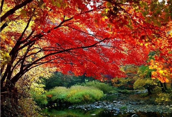 秋天,“晓来谁染霜林醉”,这里漫山枫叶,层林丹染,“霜叶红于二月花”;