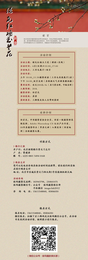 活动地点: 北京 上午上课在三里屯佳能展厅,下午外拍在故宫南门集合