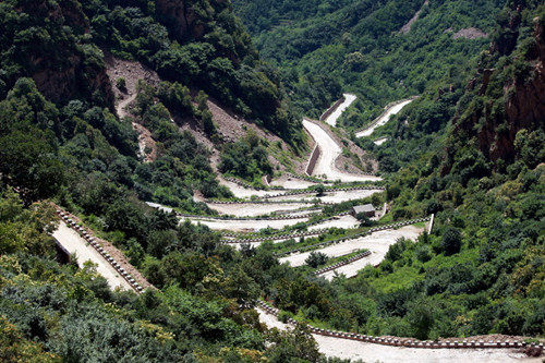 人称小张家界的天子谷.东指壶山,位于北京平谷区和河北兴隆县交接处,海拔1243米,为平谷第一高峰。山路曲折,以图为证,风景优美,山西边是平谷玻璃台乡,山东边是河北省。