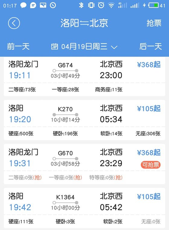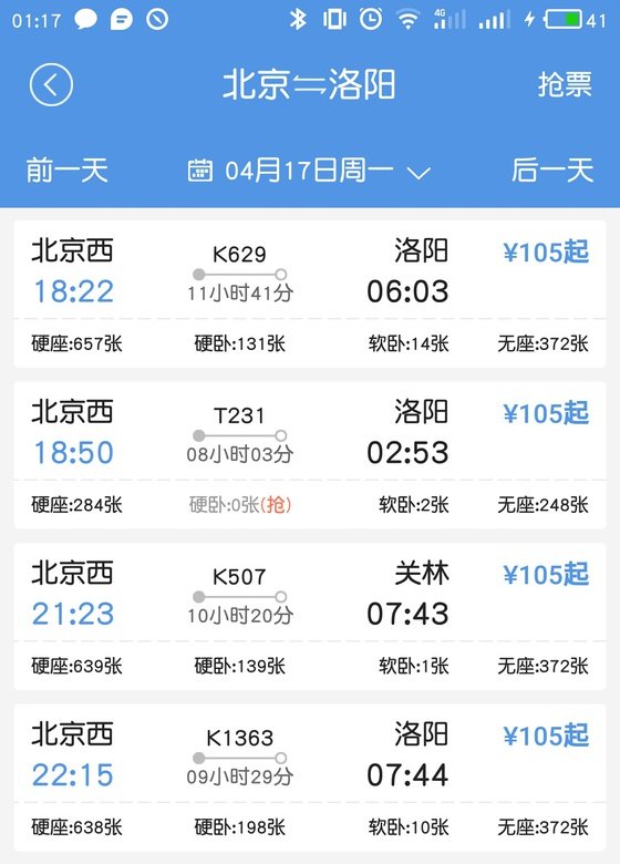 去程:全国各地—洛阳(例北京) 北京西17日晚上K629K1363次车均可到达洛阳,几个车次任意购买;网上预售火车票提前20天就可以购票。