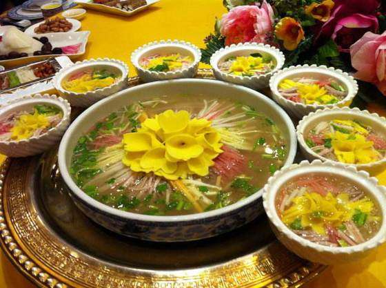 洛阳水席是洛阳的传统美食,历史悠久,古今驰名,千年以来,长盛不衰。洛阳水席作为洛阳传统的饮食风俗,和洛阳牡丹花会、龙门石窟并称为洛阳三绝。所谓“水席”,有二层含义。一是以汤水见长,二是吃一道换一道,一道道上,象流水一般,故名“水席”。水席以酸辣味为主,由24件组成,简称“三八席”。先上8个冷盘下酒菜,冷盘为4荤4素。再上16个热菜,热菜用不同型号的青花海碗盛放。16菜中有4个压桌菜。其它12个菜,每3个味道相近的为一组,每组各有一道大菜领头,又叫“带子上朝”,吃一道上一道,如行云流水。
