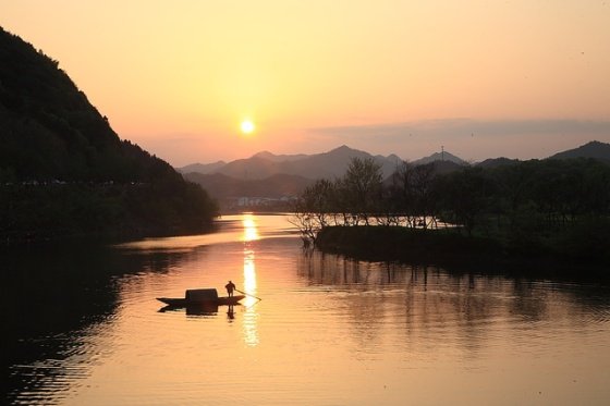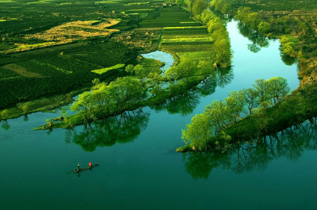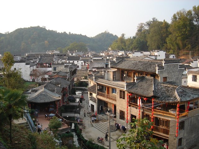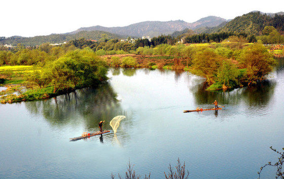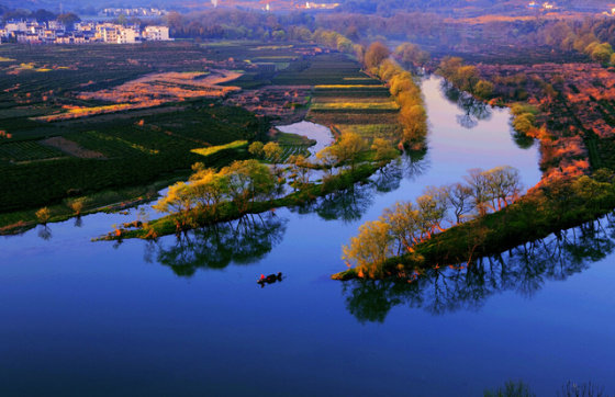 庆源村依湖而立。湖中有一座狭长的小岛夹在两岸之间,形状犹如一弯月亮,这就是月亮湾。偶有三五农妇临湖浆洗,时常引得路人纷纷驻足,下车拍个够。月亮湾让人感觉就像一弯秀水,给人很乖很美丽很内敛的感觉,仿佛一位身材窈窕的山村小女子,清丽脱俗,让你眼前一亮却又说不上到底哪里美。朝阳映在水上,弯弯的水面镜子一般照着一切。中间那一个月牙形的小岛小得让人怜爱,一条更小更可爱的小船儿依偎在小岛的岸边,一切显得都是那么宁静。月亮湾不远处的徽派民居也非常美,清一色的明清建筑风格,石库门坊,高宅厚墙,水磨青砖,精雕细刻,这些建筑几乎散落在每一个村庄,显现出曾经的殷实与安康。那粉墙黛瓦,层层叠叠,简洁洗炼,古朴典雅的黑白建筑依山傍水,掩映在田垅和碧野,小桥、流水、人家中,散发着一种别样的韵味。