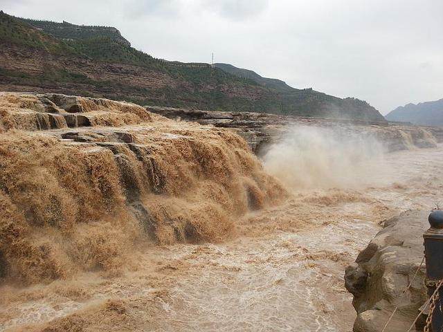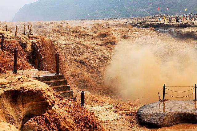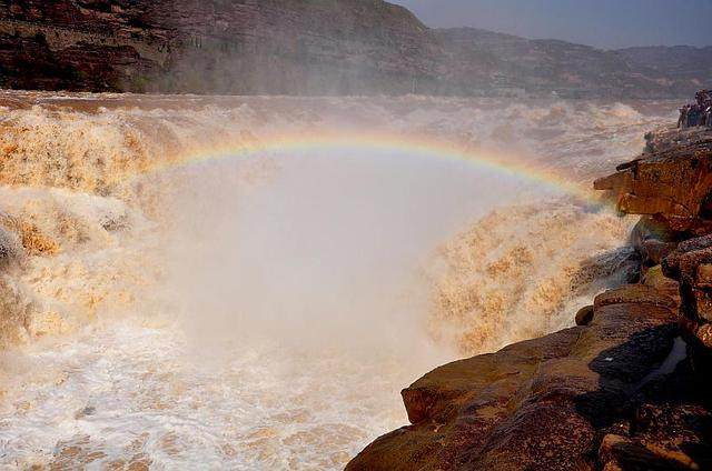 闻名遐迩的壶口瀑布位于山西省吉县和陕西省宜川县之间秦晋大峡谷河段,素有金瀑之美誉, 源出昆仑衍大流,玉关九转一壶收。瀑布两岸苍山巍巍。危石突兀,雄浑古朴。瀑流排江倒海,慑人魂魄。如狮吼,如惊雷,其大音十里可闻。没有美国尼加拉大瀑布的张扬外向,没有黄果树瀑布的钟灵毓秀,壶口瀑布如陕北悲情的信天游,酣畅淋漓的秦腔,原始而有野性,豪放而坦城。极目四望:滚滚黄河从舒缓宽阔约400米的河床陡然收束跌落至宽40余米的深槽,这深槽形似巨壶,壶口由此得名。俯视河水入壶,悬流喷壁,鼓若山腾,雨雾迷蒙。仰望则滚滚黄河天际涌来,势如千山飞崩,四海翻腾。难怪诗仙李太白惊呼:君不见黄河之水天上来,奔流到海不复回。伫立在临近瀑布上一块被迷蒙水雾笼罩的巨石上,听轰鸣的涛声,看满目浊浪排空,常有窒息眩晕之感;感受风挟水气铺头盖脸,弄得浑身湿透,倒也舒坦浪漫;你若有缘,天气晴好,十之八酒会有彩虹惊现,或长红汲水,或横跨秦晋,若隐若现,如梦如幻,一时恍若置身仙境。红尘往事,涤荡一空,心灵一如翡翠般透明,纵有万千不如意事,尽可付诸滔滔。