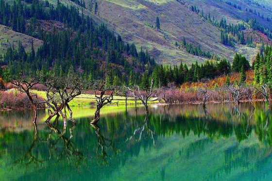 行至长坪沟,当你沿栈道绕行至幺妹峰侧,观赏雪山飞瀑之后,经过不断地缓坡行至木骡子,入目的是被红杉包围的高山海子,在原始粗狂中透出阵阵灵气