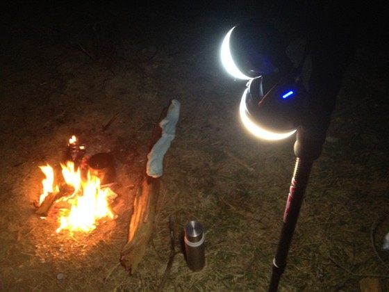 将两款产品挂在登山杖上,将营地照得很亮(不过此图中还是没怎么体现出来,我认为15m左右的范围确实是有的),再点一堆篝火,很舒服,以至于我基本上都不用拿出手电。这里还有个小细节,CC在开灯状态下电池电量会一直显示,而C2只有开灯时显示和如果电量只剩10%的时候显示,个人感觉CC这样的设计更好,便于我们在使用中及时了解所剩电量,以便灵活调节使用时间,保证整个露营阶段的照明输出。