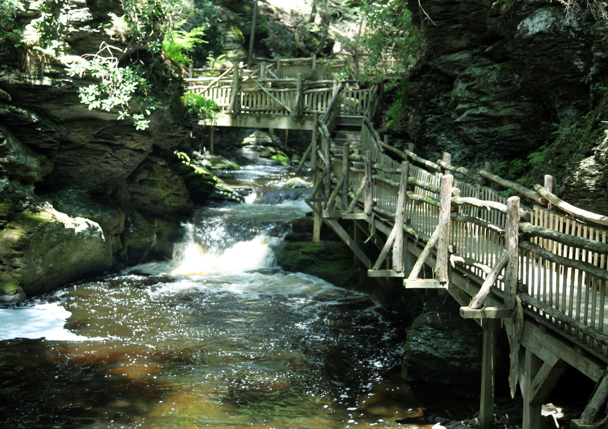 布什基尔(Bushkill )瀑布是宾州著名的风景名胜,有“宾夕法尼亚州的尼亚加拉瀑布”之说。这种独特的八大系列的瀑布,坐落在树木繁茂的波科诺山(Pocono)深处,通过登山步道和木桥呈网络环状的去欣赏不同的瀑布和周围森林的美景。