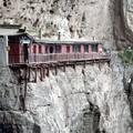仍沿左方的崖壁逶迤而行,到一山坳平地,只见一个个舍利塔拔地而立,这是历代和尚的墓地。过此,在山穷水尽处,向左拐一九十度的弯,即见一排(十间)悬空的木结构建筑横亘于半山崖上。在这一排建筑物的左方是一深邃莫测的巨大岩洞,岩顶威严地耸立着四颗巨松...