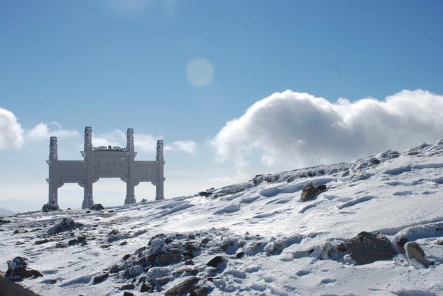 北台:叶斗峰海拔3061米,五台最高,有“华北屋脊”之称,其台“顶平广,圆周四里,其下仰视,巅摩斗杓,故以为名。”康熙皇帝赋诗赞曰:“绝磴摩群峭,高寒逼斗宫。钟鸣千嶂外,人语九霄中。朔雪晴犹积,春冰暖未融。凭虚看陆海,此地即方蓬。