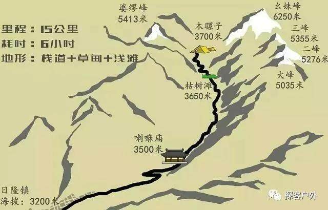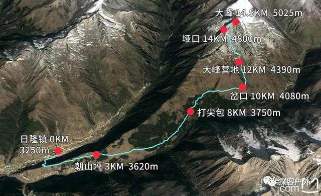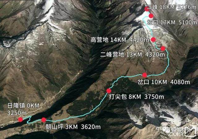 海拔:营地4260米--二峰顶峰5276米--客栈3200米--成都500米