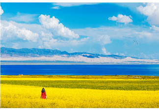 青海湖被远山怀抱,走到湖畔,我们脚下又是一片草原,这里非常适合我们拍照,建议穿红色的衣服,既能凸显油菜花田的金黄,湖水的深邃,也能凸显你曼妙的身姿。