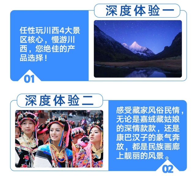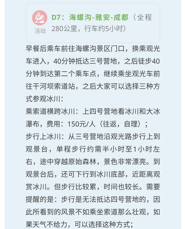 【费用包含】 1、交通:包含全程往返交通费用,使用具备合法营运手续的运输车辆。 成团人数1-6人,使用别克商务GL8或江淮瑞风商务车; 成团人数7-10人,使用12座江淮星锐商旅车; 成团人数11-16人,使用17-23座中巴旅游车; 成团人数17-22人,使用29座中巴旅游车; 成团人数23人以上,安排30-49座正规旅游大巴车。 2、住宿:按行程所列标准入住(7晚双人标准间独卫),包含活动前一晚赠送成都商务酒店住宿(如不住成都赠送酒店,费用不退)。 3、餐食:包含行程内6晚餐7早餐,午餐均为自理。 4、门票:包括四姑娘山双桥沟门票、丹巴甲居藏寨门票、亚丁景区门票(观光车、电瓶车均为自理)、海螺沟门票(观光车索道自理)。 5、领队:本地资深户外领队全程服务。活动成团人数不足8人,由司机提供向导服务。司机熟悉路线并给队员游玩建议,但不会像专业导游一样解说,请理解。 6、保险:中国人民保险游客意外险最高保险额80万元。 7、其他:司机领队餐食住宿补贴等,行程中不需要队员另外承担司机餐食费用。 【费用不含】 1、大交通:各地往返成都的大交通费用。 2、各景点门票及观光车费。 3、以及费用包含项目里所列之外的其他费用。 4、报价未含发票。 5、单房差:本行程不收自然单房差,如果队员要求自己全程住宿一间,则需要补单房差。单房差根据季节不同,价格不同。 【我们郑重承诺】: 所有路线绝无安排参观水晶店、牦牛肉店、药材店、工艺品店、茶叶店、其他特产店等进店计划! 所有路线绝无诱导你参加篝火晚会或去藏民家家访的计划! 所有路线绝无领队中途介绍其他收费性景点和旅游项目计划!