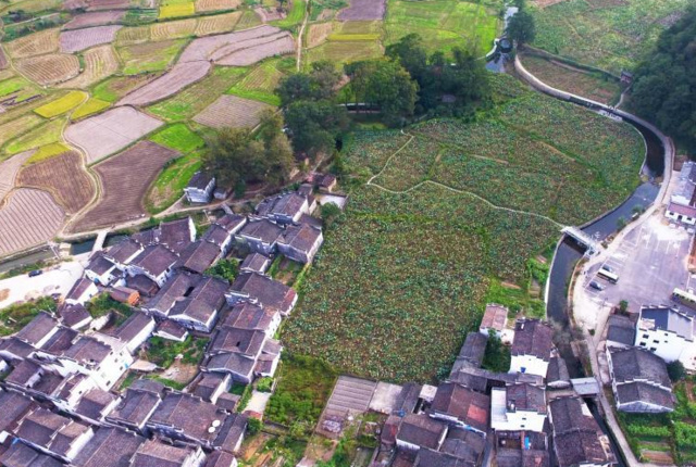 村庄水口林挺拔葱郁的枫香,与茂盛的野藤苦竹一起,交织出万石山翻滚的浓绿。