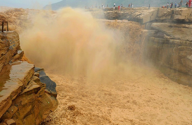 瀑布上游黄河水面宽300米,在不到500米长距离内,被压缩到20-30米的宽度。1000立方米/秒的河水,从20多米高的陡崖上倾注而泻,形成”千里黄河一壶收”的气概。