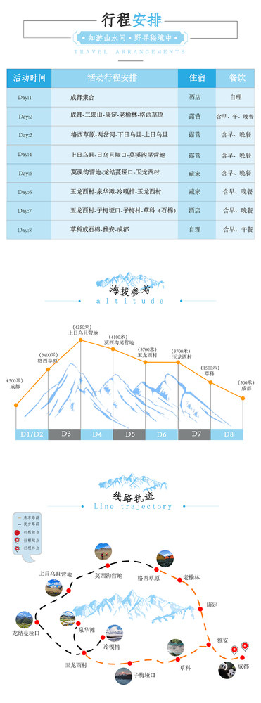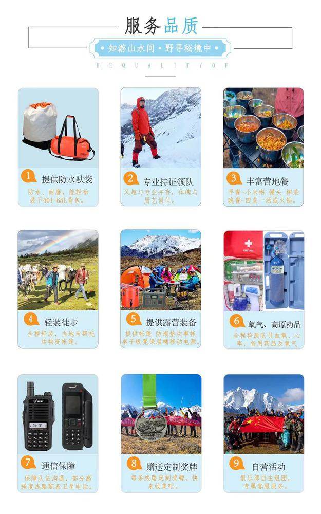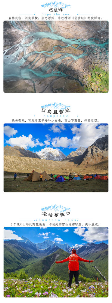 【2023年活动排期】 全年组队22期,欢迎独立定制 第01期: 04月29号集合--05月06号 (五一节) 第02期: 05月27号集合--06月07号 第03期: 06月03号集合--06月10号 第03期: 06月10号集合--06月17号 第04期: 06月22号集合--06月29号 (端午节) 第05期: 07月01号集合--07月08号 第06期: 07月08号集合--07月15号 第07期: 07月15号集合--07月22号 第08期: 07月22号集合—07月29号 第09期: 07月29号集合--08月05号 第10期: 08月05号集合--08月12号 第11期: 08月12号集合--08月19号 第12期: 08月19号集合--08月26号 第13期: 08月26号集合--09月02号 第14期: 09月02号集合--09月09号 第15期: 09月09号集合--09月16号 第16期: 09月16号集合--09月23号 第17期: 09月28号集合--10月05号 (国庆节) 第18期: 09月29号集合--10月06号 (国庆节) 第19期: 09月30号集合--10月07号 (国庆节) 第20期: 10月10号集合--10月17号 第21期: 10月14号集合--10月21号 第22期: 10月21号集合--10月28号 全年执行基础价:3480元/人,国庆黄金周执行价:3980元/人 行程安排 D1:成都集合 今日全国各地的队友将来到成都集合,统一入住我俱乐部安排的酒店。如果您的时间比较宽裕,还可以自行安排在成都市区的旅游活动,推荐游览锦里、武侯祠、杜甫草堂、宽窄巷子等景点,品尝成都特色美食,感受天府之国的休闲生活,相信绝对会让大家深深地体会到什么是“休闲之都”啦! 住宿:成都市区酒店(双人标间) 餐饮:全天餐费自理 海拔:成都约540米 D2:成都-雅安-二郎山-泸定-康定-老榆林-电站-格西草原 早餐后在酒店门口集合乘车经成雅高速前往雨城雅安,沿途欣赏川西田园风光。下高速沿318国道一路西行,伴着秀美青衣江途径二郎山隧道、大渡河、泸定桥,康定城,一路行摄,康定城采购物资后继续前进,在老榆林村换乘小车前往格西草原露营。 住宿:格西草原露营 餐饮:酒店含早,午餐自理,营地晚餐 需时:约360km,行车7小时左右; 海拔:格西草原约3400米 D3:格西草原-两岔河-下日乌且-上日乌且 早餐后向上日乌且进发。沿途欣赏高原风光,2小时后到达大河坝,河对岸隐约出现大面积红石滩,领队带领大家稍微驻足拍照。一路向南,沿途欣赏田海子雪山(海拔6070米)、小贡嘎(海拔6027米),晚上抵达上日乌且(海拔4350米)扎营。 住宿:上日乌且营地露营 餐饮:营地早餐,午餐(路餐)自理,营地晚餐 需时:约17km、徒步7.5小时左右 海拔:老榆林3200米、下日乌且4100米、上日乌且4350米 D4:上日乌且-日乌且垭口-莫溪沟尾营地(勒多漫因BC) 早餐后拔营出发,开始翻越日乌且垭口,海拔高度上升700米,一路爬升直观感受高山植被的变化。沿途欣赏小贡嘎、嘉子峰、日乌且冰川风光,及其冰川、高山湖泊,运气好的话在垭口附近还可以发现古生物化石。傍晚在莫溪沟尾扎营。体力不支者可在日乌且牧场雇佣马匹骑马上山(仅限夏及秋季)。 住宿:莫溪沟尾营地露营 餐饮:营地早餐,午餐(路餐)自理,营地晚餐 需时:约16km、徒步6小时左右 海拔:上日乌且4350米、日乌且垭口海拔4920米、莫溪沟尾营地4100米 D5:莫溪沟营地(勒多漫因BC)-龙结蔓垭口-玉龙西村(泉华滩) 早餐后莫溪沟营地出发,一路缓坡翻越龙结蔓垭口,垭口处我们能提前观看到贡嘎主峰的雪山群,6 7 8月山坳处野花遍地,与远处的雪山遥相呼应,美不胜收。翻越垭口后一路下缓坡,沟底乘车前往玉龙西村藏家入住。时间尚早即前往泉华滩游玩。 住宿:玉龙西村藏家多人间 餐饮:营地早餐,午餐(路餐)自理,藏家晚餐 需时:约8km、徒步5小时左右 海拔:莫溪沟尾营地4100米、玉龙西村3700米 D6:玉龙西村-冷嘎措-玉龙西村 藏家早餐后前往冷嘎措,需要徒步大概3个小时抵达,体力不好的可以选择骑马上山,冷嘎措被誉为贡嘎山的一滴眼泪,也是拍摄贡嘎群山倒影最佳的地方,傍晚时分日照金山倒影在冷嘎措湖中,水天相接,很庆幸能用眼睛记录下这壮观的美景,根据大家的身体情况,看完日落原路返回。 住宿:玉龙西村藏家多人间 餐饮:营地早餐,午餐(路餐)自理,藏家晚餐 需时:约10km 、徒步5小时左右 海拔:冷嘎措4550米 D7:玉龙西村-子梅垭口-子梅村-草科(或石棉) 从玉龙西村出发,乘车前往子梅垭口观看日出,子梅垭口是拍摄贡嘎山的最佳观景平台,朝拜贡嘎神山后乘车到子梅村开始徒步,抵达巴望海后一路顺着巴望海边沿在山林里漫步俯视巴望海的全貌。休整吃过午饭后,徒步至界碑石,乘车沿田湾河抵达草科,体验草科的天然温泉,晚上入住草科(或石棉)酒店。 住宿:草科或石棉酒店(双人标间) 餐饮:早餐,午餐路餐自理,草科或石棉晚餐 需时:约18km、徒步6小时左右 海拔:下子梅村3400米、草科1500米 D8:草科或石棉-雅安-成都 早餐后出发上雅西高速经雅安返回成都,散团后大家可以自由游览。返回成都的时间约下午3点左右,建议订六点以后的机票返程。 住宿:自理 餐饮:含早、午餐,晚餐自理 需时:约330km、行车5小时左右 海拔:草科1500米、成都540米 【备选行程】 在活动执行过程中,如因天气因素(大雪等)导致日乌且垭口无法通过,行程则调整如下: D1:成都集合 D2:成都-康定-格西草原 D3:格西草原-两岔河-盘盘山营地 D4:盘盘山营地-垭口-玉龙西村 D5:玉龙西村-泉华滩-冷嘎措-玉龙西村 D6:玉龙西村-子梅垭口-贡嘎寺-子梅村 D7:下子梅村-巴王海-草科-石棉 D8:石棉-成都 费用说明 【费用包含】 1.交通:进出山大交通费用,根据人数选择合适车型(含老榆林村路口-格西草原中转车,玉龙西村路口-玉龙西村中转车,玉龙西村-