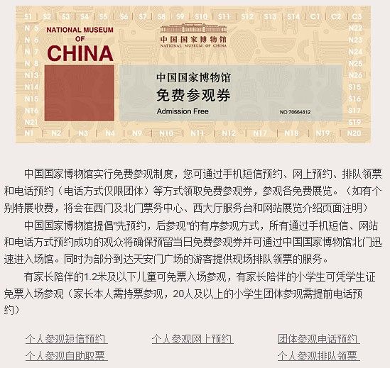 八、如因临时举办重大活动致使预约后无法正常换领当日免费参观券,我们将安排调换参观时间。请您参观前注意浏览中国国家博物馆网站(www.chnmuseum.cn)、微博(新浪微博http://weibo.com/chnmuseum 、腾讯微博http://t.qq.com/chnmuseum)发布的相关信息,合理安排参观行程。