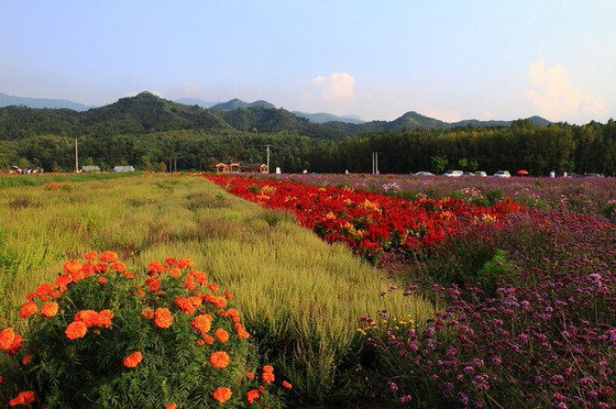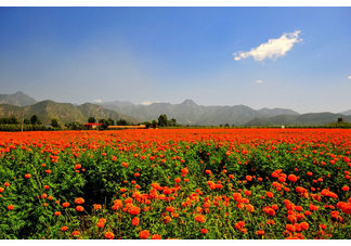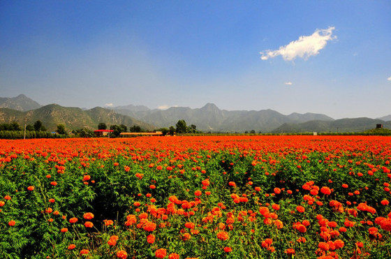 ❀ 【 看片说景 】 ❀【四季花海】整合了延庆东部山区四海镇、珍珠泉乡、刘斌堡乡的沟域资源,西起刘斌堡乡刘斌堡村,东至珍珠泉乡南天门村,途经三个乡镇,最后向北与千家店镇“百里山水画廊”闭合。“四季花海”沟域总长度47公里,规划面积164.17平方公里。四季花海是一个世外幽谷,数千亩橙色的万寿菊被群山环抱,每一块菊田明亮得就像是画家的油画笔肆意涂抹上的痕迹,带着醉人的艺术感。如此情景,让大家都不约而同地惊叹起来。