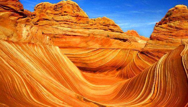 波浪谷是后来大家给起的,原本这地儿不叫波浪谷,因为其丹霞地貌与美国的波浪谷尤为相似,所以也称呼为波浪谷!这些岩石,上面有着像波浪一样的纹路,所以这个地方被叫做"The wave",这种古老的沙丘随着平原的上升,加上漫长的风蚀,水蚀,峡谷里砂岩的层次逐渐清晰地呈现出来。平滑的,雕塑感的砂岩和岩石上流畅的纹路创造了一种令人目眩的三维立体效果。