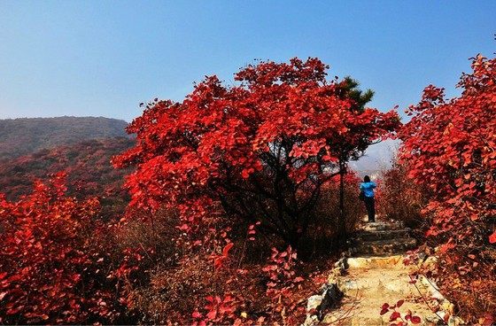 赤橙黄绿青蓝紫,谁持彩练当空舞?与香山的红叶相比,坡峰岭的红叶却别有一番情致。如果说深秋香山是“万山红遍,层林浸染”,那么坡峰岭则是“红叶绿中游,彩练当空舞”,红、黄、绿、粉、黑,与蓝天、白云交相辉映,远远望去,犹如条条彩练当空飞舞,成为流动的色彩海洋。艳丽的色彩源自这里种类丰富的植物资源。