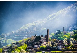【中路藏寨】 白色的藏房和金顶的寺庙在透蓝的天空下隐约可见,色彩缤纷却毫无零乱之感。中路藏寨历史悠久的古碉楼,古朴隆重的成人仪式,形式多样的锅庄舞,庄严肃穆的古藏戏,华美艳丽的嘉容藏服,妙趣横生的顶毪衫习俗,热气腾腾的酥油茶,香脆可口的火烧馍馍,所有的这些又是如此活色生香。敬天畏神的中路人是藏传佛教的虔诚信徒,自然崇拜、图腾崇拜随处可见。梦里寻她千百度,置身桃源却惘然。