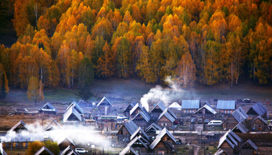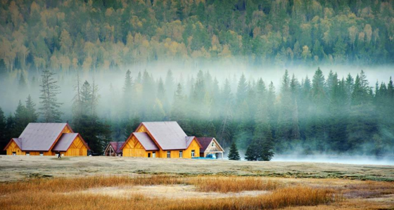 禾木乡位于新疆北部布尔津县境内,靠近蒙古、俄罗斯边境,是喀纳斯民族乡的乡政府所在地。禾木乡生长有丰茂的白桦树林,是一个美丽的北疆山村,素有“摄影家天堂”之称。禾木乡的村落里随处散落着原木搭成的木屋,充满了原始的味道,半隐半现于成片的桦树林。清晨,云雾挂在山腰间,木屋开始升起袅袅的炊烟,阳光洒落白桦林上,无人看管的牛羊在悠闲地埋头吃草,平坦草地上空似远还近的蓝天、白云,色彩丰富得让人窒息。