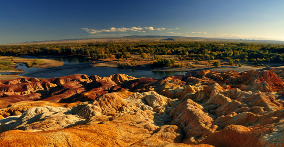早饭后,我们直接前往五彩滩。五彩滩的特别,还由于它色彩绚烂,形状缤纷。因为这里有侏罗纪时代的煤层,经过千万年风蚀雨剥以及河水的冲刷,在几乎寸草不生的河滩上出现了红、绿、紫、黄、棕等鲜艳的色彩。在河水的映衬和夕阳的照射下,就如同走进一个五彩斑斓梦幻般的世界,这样的美,只能用相机记录下来,用一辈子的时间去欣赏它!