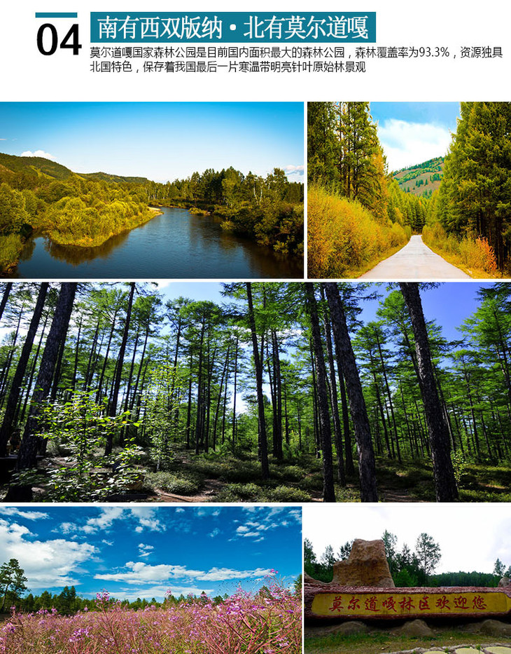 07:30吃完早餐之后前往闻名遐迩具有\\\"南有西双版纳,北有莫尔道嘎\\\"之称的莫尔道嘎国家森林公园。莫尔道嘎国家森林公园是内蒙古大兴安岭首家国家森林公园,占地面积五千多平方公里,是目前国内面积最大的森林公园。