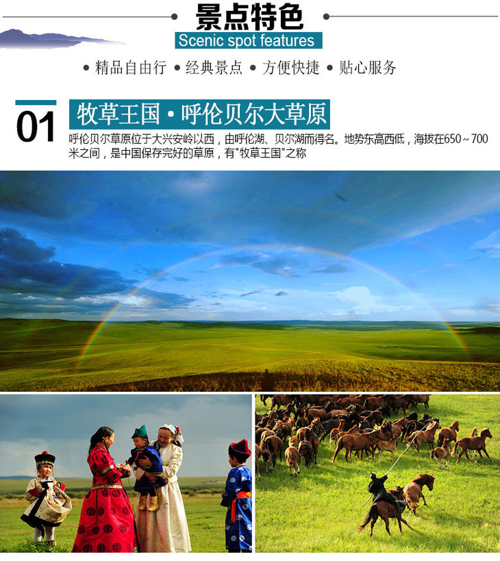 不走回头路,呼伦贝尔环线一圈我们立志于打造与众不同的路线(自然原生态路线)注重您游玩的品质,带您穿越呼伦贝尔每一寸土地、领略无限风光、多元素民俗,希望有我们的陪伴让您呼伦贝尔之行终身难忘。