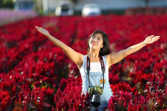 七夕佳节那里去,鲜花丛中影留念;赏花何必去远方,四季花海正怒放。