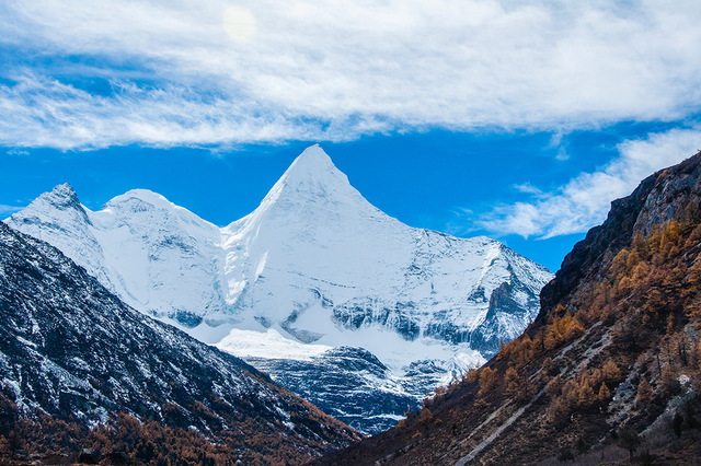稻城亚丁风景区:在四川省、甘孜藏族自治州、稻城县、香格里拉镇(日瓦乡)、亚丁村,有一个地方保持着地球上近似乎绝迹的纯粹,被国际友人誉为“水蓝色星球上的最后一片净土”。景区内主要景点由三座“神山”和三个“圣湖”组成。三座“神山”分别是仙乃日、央迈勇、夏诺多吉。仙乃日(意为观世音菩萨)海拔6032米,是稻城县第一高峰,看似观世音菩萨坐于莲花台上,手持宝瓶乘祥云而来。三个“圣湖”分别卓玛拉错、牛奶海、五色海,其中最高的是五色海,海拔在4800米左右。