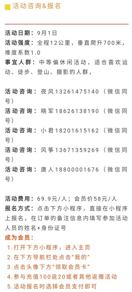 活动费用:69.9元/人;会员价58元/人 成为会员: 1.打开下方小程序,进入主页 2.在下方导航栏处点击“我的” 3.点击头像下方“领取会员卡” 4.参与充值100返20或者其他返赠活动 5.活动报名时选择会员支付即可