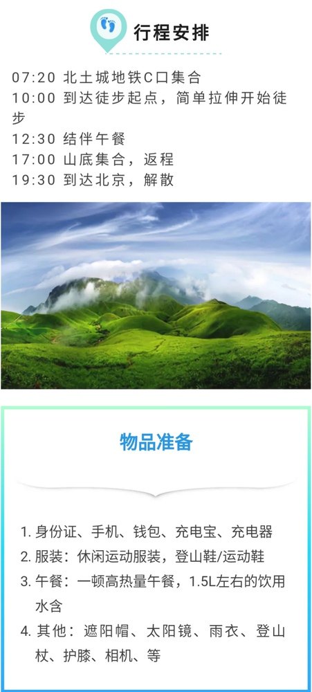 07:20 北土城地铁C口集合 10:00 到达徒步起点,简单拉伸开始徒步 12:30 结伴午餐 17:00 山底集合,返程 19:30 到达北京,解散