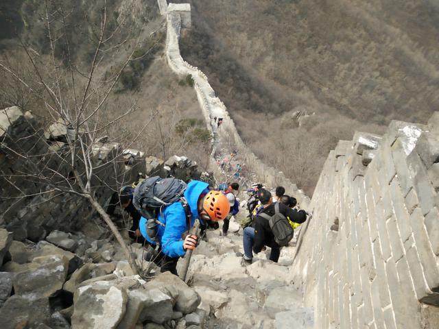 不过爬山不是光靠感觉,感觉和现实总是有很大的差距。我们全穿队伍的大巴车停在北沟村,我们下车之后就开始出发了。队伍准备在山脚的一个大磨盘集合拍照留念,可我还没有走几百米就觉得腿酸了。可是这才刚刚起步,我还没开始爬山呢怎么就不行了?我不会这么怂吧?可能是刚开始走,我的筋骨还没有舒展开,等真正走起来就应该好了吧?抱着姐就是辣么自信的心态姐一路向前!走到大磨盘合照之后开始正式向山顶进发。可是我却走不动了,怎么越走越心慌,不敢用力呼吸,连深呼吸都不敢做了,感觉可能是胃病犯了,我只能放慢前进的脚步,慢慢调整呼吸,使呼吸和脚步能够相互配合,实在配合不来我就坐在地上歇一会儿再走。记得上一次雪后爬慕田峪也是这条路线,那会儿爬的甚是轻松,一点都没觉得费力,这才几个月没有运动身体就懒成这个样子了,看来这段时间是把我的腿养懒了。同行的朋友们看我走的那么费力,就主动帮我分担身上的负重,减轻了背上的压力,我走起路来也轻松了一些。就这样我慢慢的走到了长城脚下。可是这时候领队已经不知所踪,我们后来到达长城边上的队伍被巡山检查的拦了下来,我们不知如何是好,用手台呼叫虎子,虎子让我们沿着石板路绕过去,检查的人就拦在石板路上,我们就钻过一片烂柴堆绕过检查人员,继续前行。终于在石板路的尽头我们踏上了长城。顿时我感觉空气清新,呼吸顺畅,前所未有的兴奋随之而来。踏着脚下的长城青石板,走过岁月的痕迹,沿着虎子说的路线我们一路走下去。虽然是破碎的城墙,但看着他依附于群山山势的起伏跌宕,长在山顶及峭壁上的一砖一石,依然能感受到他的宏伟气势,感受到他当年如何抵御外侵,展现他重要的军事地位。