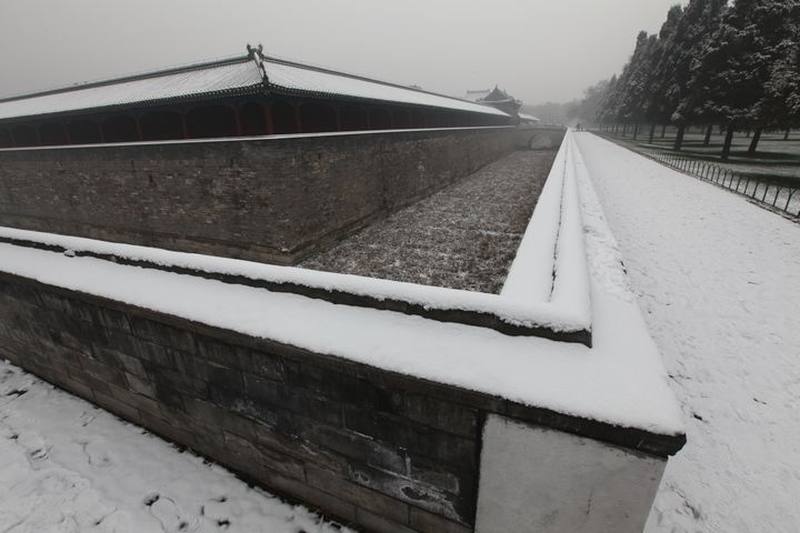 小雪浓雾使暖冬后的古老天坛更显神秘