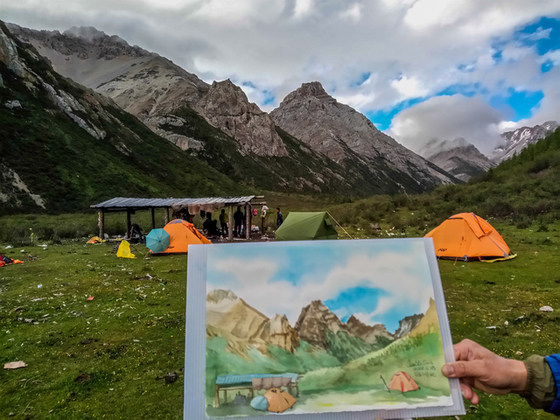 早餐之后,我们开始翻越长海垭口,徐徐回望长海营地。长海垭口海拔4200M,从长海翻越主要是路途较短,由于海拔较高,翻越时十分辛苦。到达垭口时,就可以欣赏到红星岩壮观的景象,周围的雪山,卡卡沟和阿翁沟风光。下山以后,我们就进入了“阿翁沟”,下山的道路有一段是流沙石路段,有点难走,后面经过一处高山牧场,在一路往下进入森林,走出森林就进入鱼海子营地了。